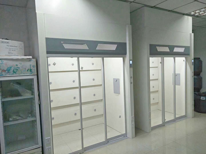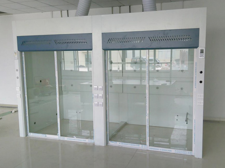 (3)走入式通風柜的門結構為鋁合金制的水平移門,表面處理為磷化后噴塑(淺灰色),門玻璃采用5MM厚鋼化安全玻璃。